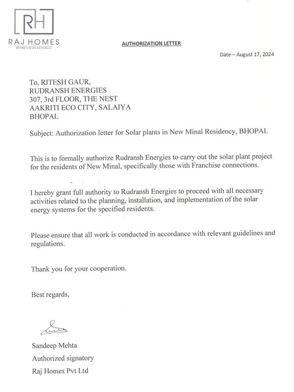 We have been authorized by RAJ HOMES to install Solar Power Plants to their ANCHAL GHRAH NIRMAN CUSTOMERS. We are the first and only company to receive such AUTHORIZATION.
